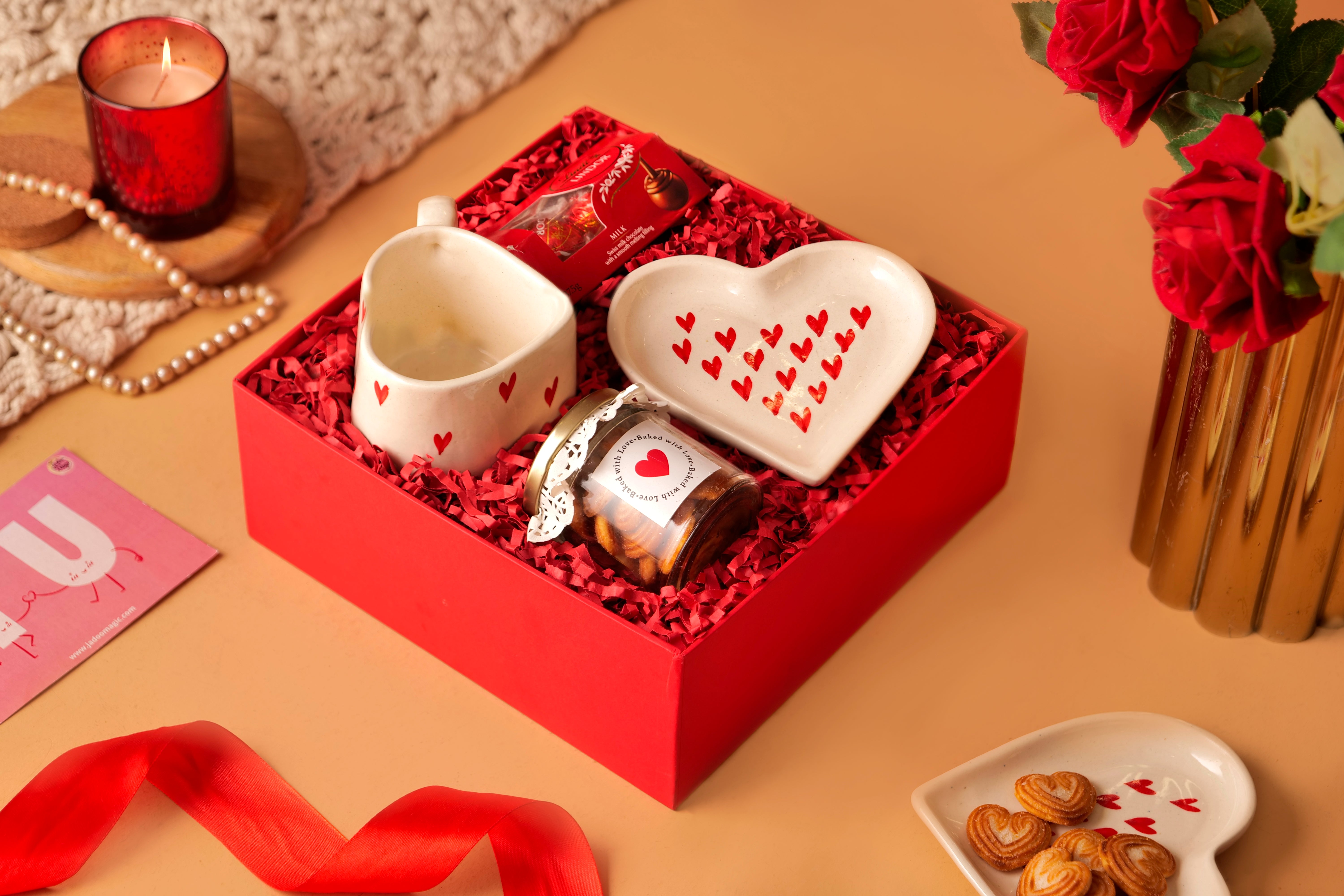 Discover the ultimate expression of love with Amour, exclusively at Jadoo Magic! This cute, romantic gift box holds a delightful Heart Mug & Dessert Plate Set crafted from fine ceramic, a jar of heavenly Heart Cookies, and indulgent Lindt Chocolate. Perfectly curated for Valentine's Day or an anniversary gift, it's the ideal way to show your special someone how much they mean to you. Make every occasion memorable with our charming and heartfelt collection designed for celebrating love.