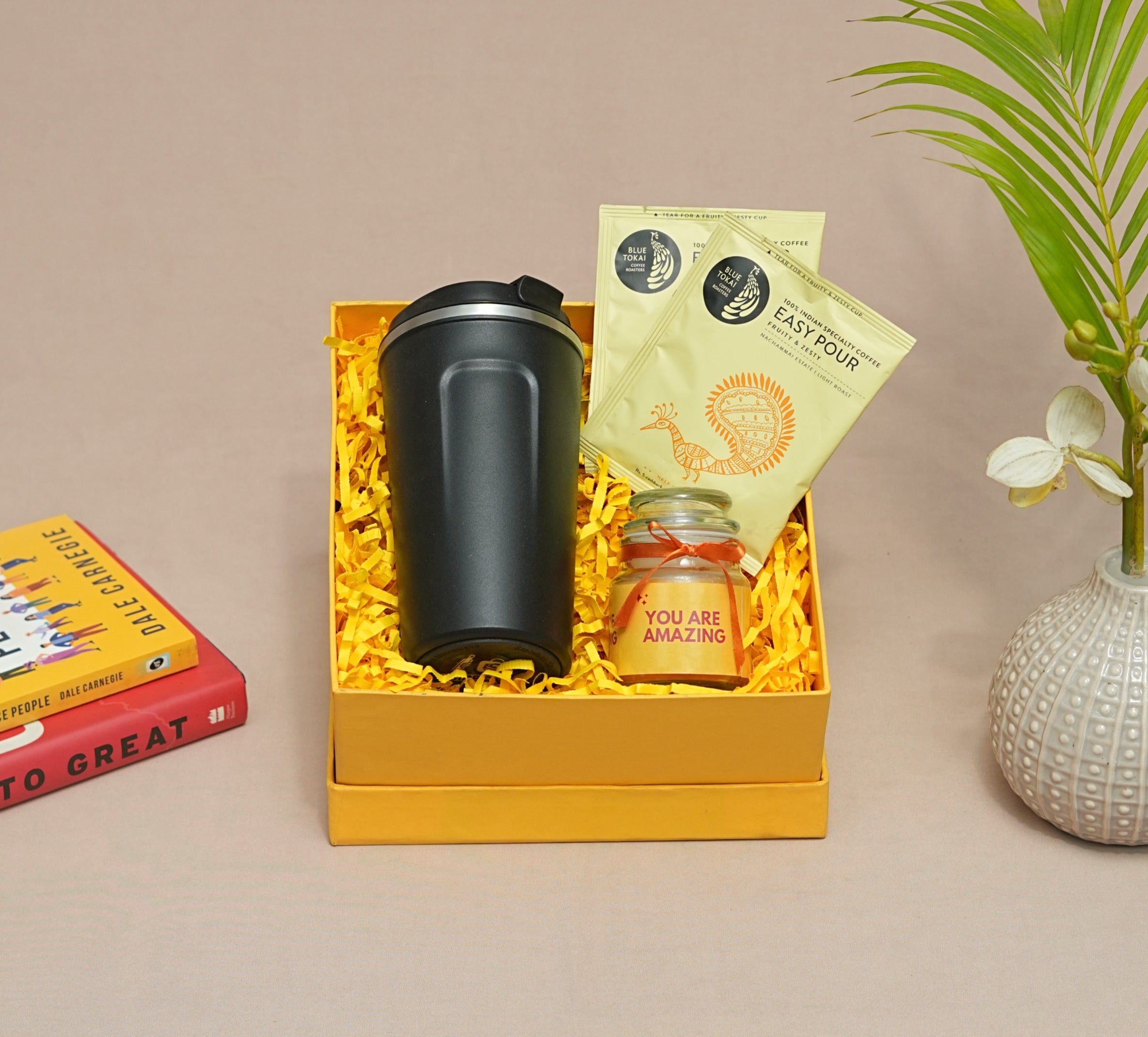 For the person who keeps the team rolling ! Your recipient will feel that "Amazing" feeling with an exclusive insulated travel tumbler, a candle jar to keep reminding their awesomeness and coffee to keep rolling. Works perfect as a gift to your co worker, celebrate work anniversaries or birthdays or even as a farewell gift