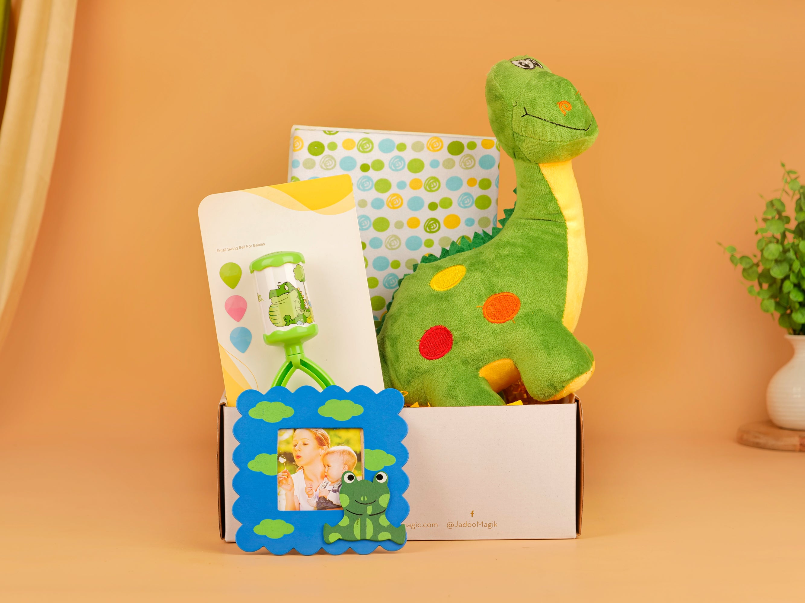 Discover the joy of Jadoo Magic with our enchanting Dino gift box! Perfect for little explorers, it features a snuggly Soft Toy Dinosaur, a delightful Toy Rattle 3M+, and a charming Wooden Photoframe for Kids to capture precious moments. Ensure your baby's comfort and safety with the Keep Me Dry Waterproof Quilted Sheet Pad. Each element of this gift box is thoughtfully curated to bring laughter, love, and lasting memories. Shop now and make your child's world even more magical!