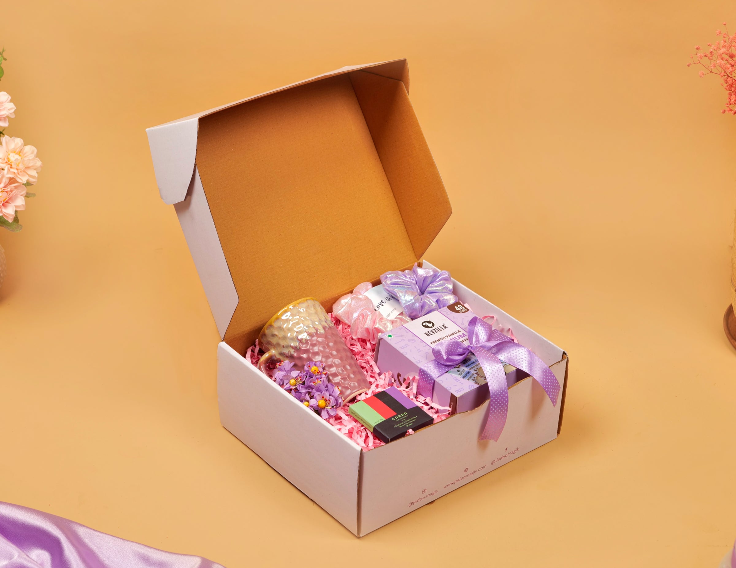 Experience the enchanting charm of Jadoo Magic with the Purple Bliss gift box. This exquisite collection includes Coffee Cubes in Creamy Vanilla, Gourmet Chocolate, two shimmering Scrunchies, and a beautifully glazed Ceramic Mug. Whether it's a birthday celebration, a bridesmaid gift, or a token for a cherished friend, Purple Bliss is the perfect choice.