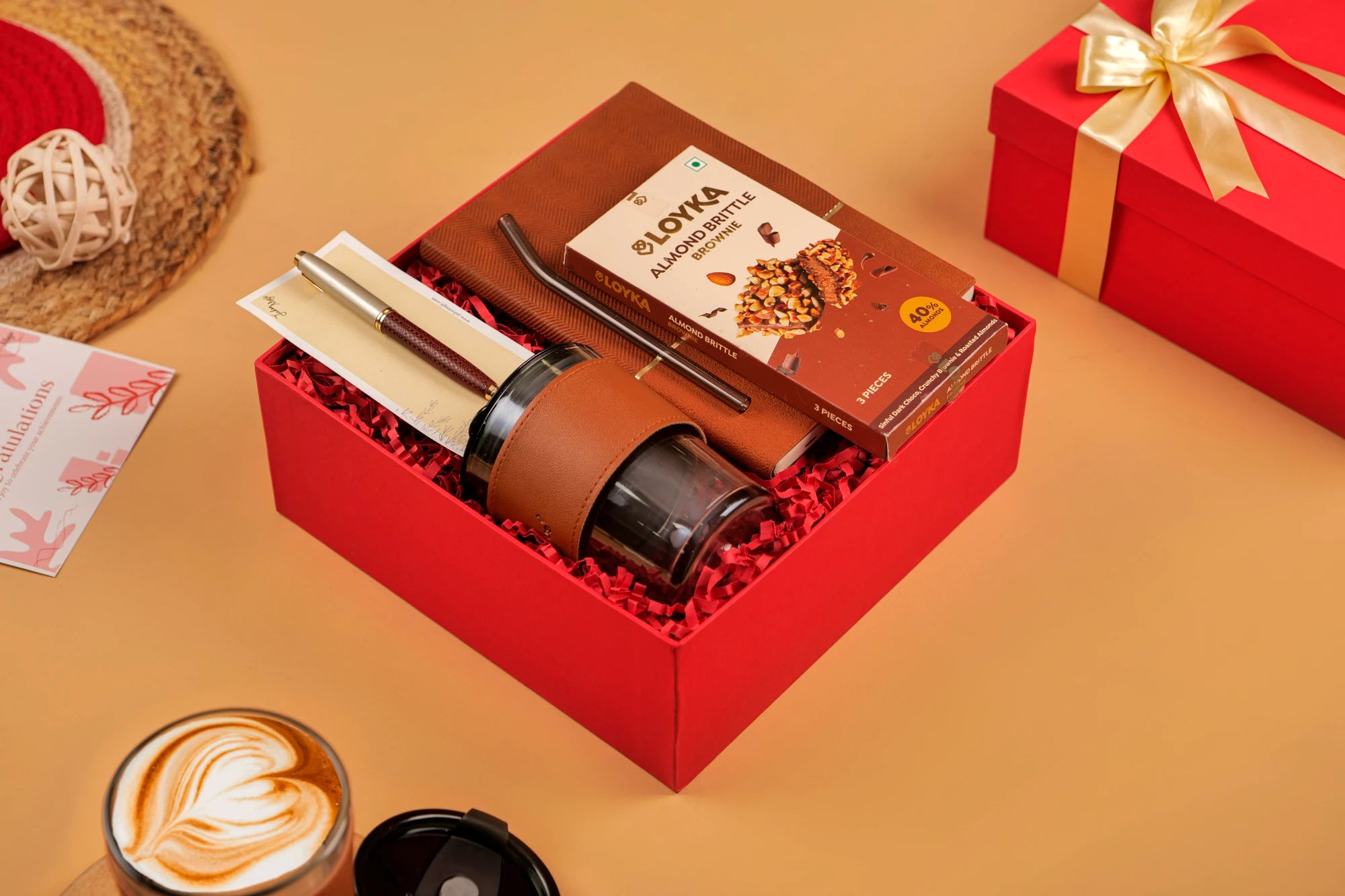 Show your clients and employees the appreciation they deserve with our elegant and thoughtful Client Appreciation Box. This gift hamper features a stylish Glass Mug with Lid and Glass Straw, a sleek premium look Notebook, and a sophisticated Ball Pen. Delight their taste buds with delectable Almond Brittle Brownies, while the functional items enhance their daily routine. Perfect for corporate settings, our box exudes a premium look and feel, making it an ideal choice for both client and employee appreciation.