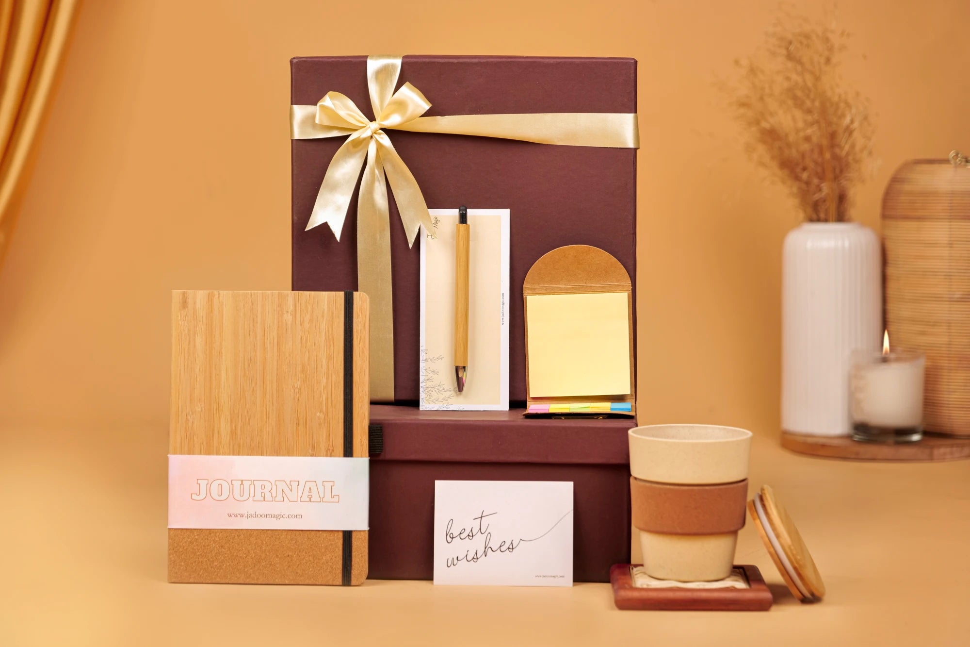 Explore the EcoEssence Hamper , a perfect blend of eco-friendly gifts and sustainable gifting solutions. Encased in a stylish gift box, this kit contains a Bamboo Cork Travel Mug, Cork Cover Notepad with Sticky Notes, Bamboo Pen, and a Bamboo & Cork Eco-Friendly Notebook. Ideal for both corporate and personal gifting, each item reflects our commitment to sustainability and quality. Whether you're looking to impress clients or surprise a loved one, our EcoEssence Hamper is an excellent choice for mindful gifting.