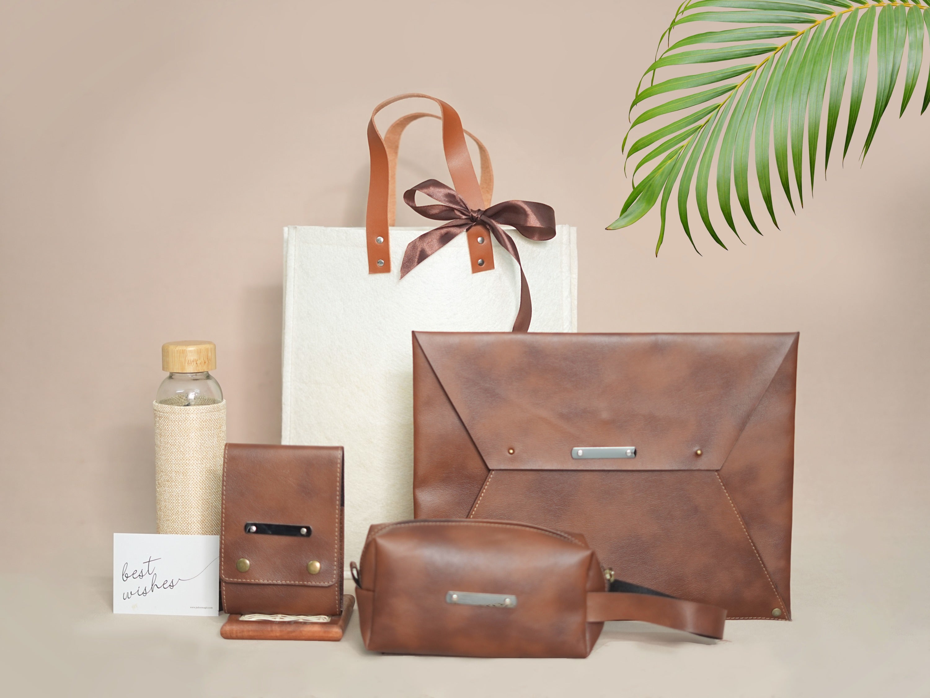 Excellence deserves exceptional recognition.The-on-the-go fabric covered glass bottle with exquisite vegan leather notepad , matching laptop sleeve/ document holderand a travel pouch makes, definately makes it an envious hamper. Instead of a regular box, we have enriched the experience with our felt bag with vegan leather handles.This kit is the ultimate gesture of gratitude for your clients and executives.