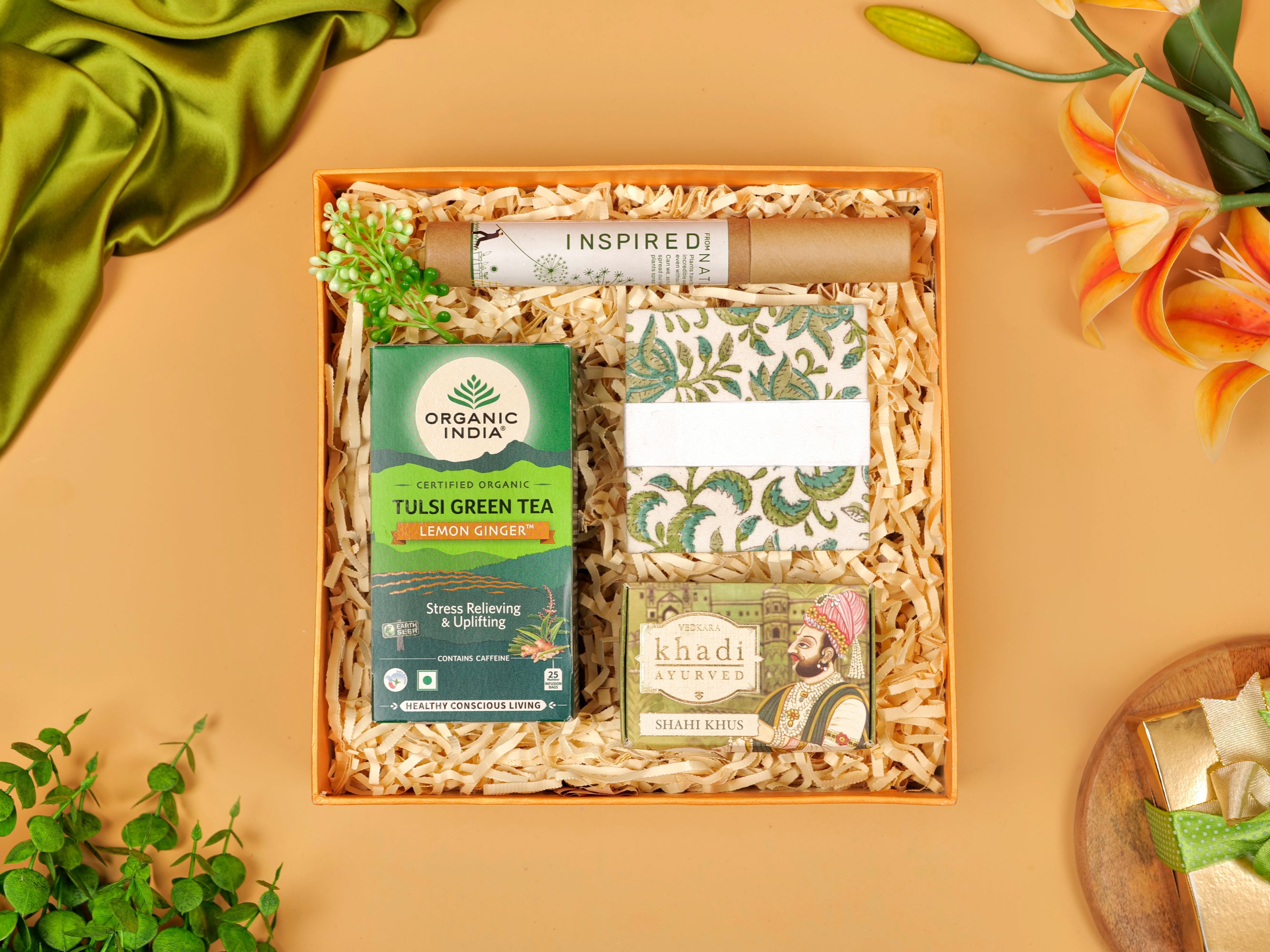 Discover the 'Go Green' gift box at Jadoo Magic, perfect for nature lovers! This eco-friendly set includes Handcrafted Tearable Desk Pads, Organic India Tulsi Green Tea Lemon Ginger Tea Bags, Khadi Ayurveda Shahi Khus Soap, and a Plantable Pencil Set. Thoughtfully curated to bring joy and sustainability, each item reflects our dedication to nature and wellness. Surprise someone special with a gift that embraces the very essence of the Earth. Shop now and make a mindful choice with Jadoo Magic!