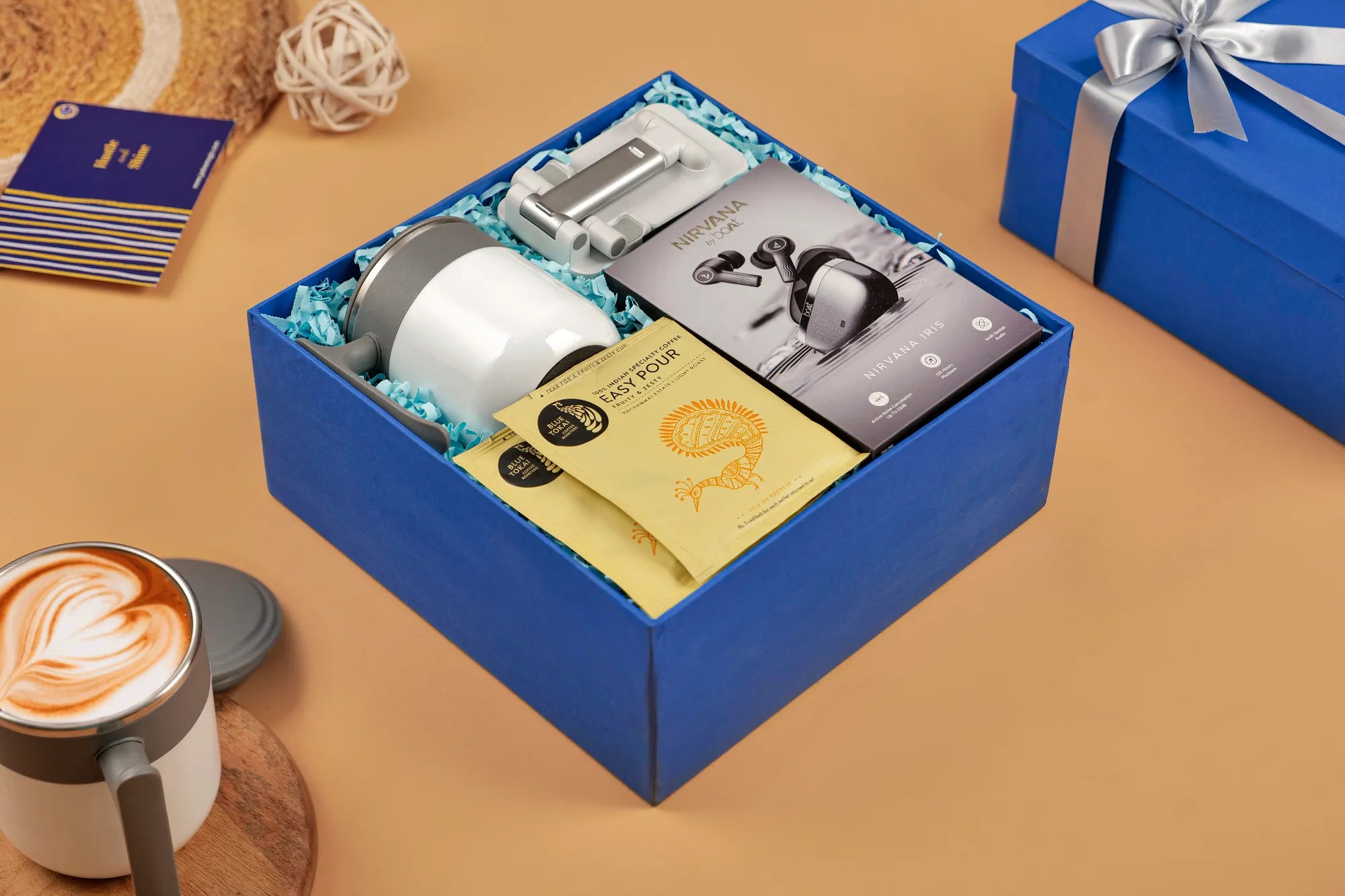 Upgrade your corporate gifting game with NextGen Essentials. This gift box includes the latest Boat Nirvana Iris Wireless Earbuds , an adjustable and foldable mobile phone stand, Blue Tokai Easy Pour Sachets, and a 300ml double wall travel mug for keeping your drinks hot on-the-go. Show your clients and employees your appreciation with this tech-forward gift box.