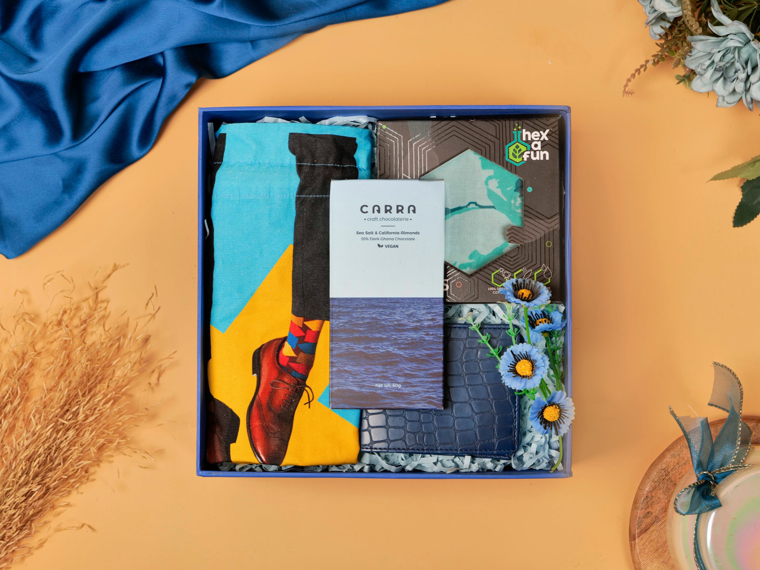 Discover Mr. Cool, exclusively at Jadoo Magic! Our luxurious gift box comprising a Pocket Square, Quirky Shoe Bag, Gourmet Chocolate, and Wallet is the perfect combination of elegance and practicality. Each item is handpicked to add a touch of sophistication and indulgence to his daily life. Elevate his style, organize his essentials, and satisfy his sweet tooth all in one go. Treat yourself or a loved one to the ultimate blend of fashion and function today!