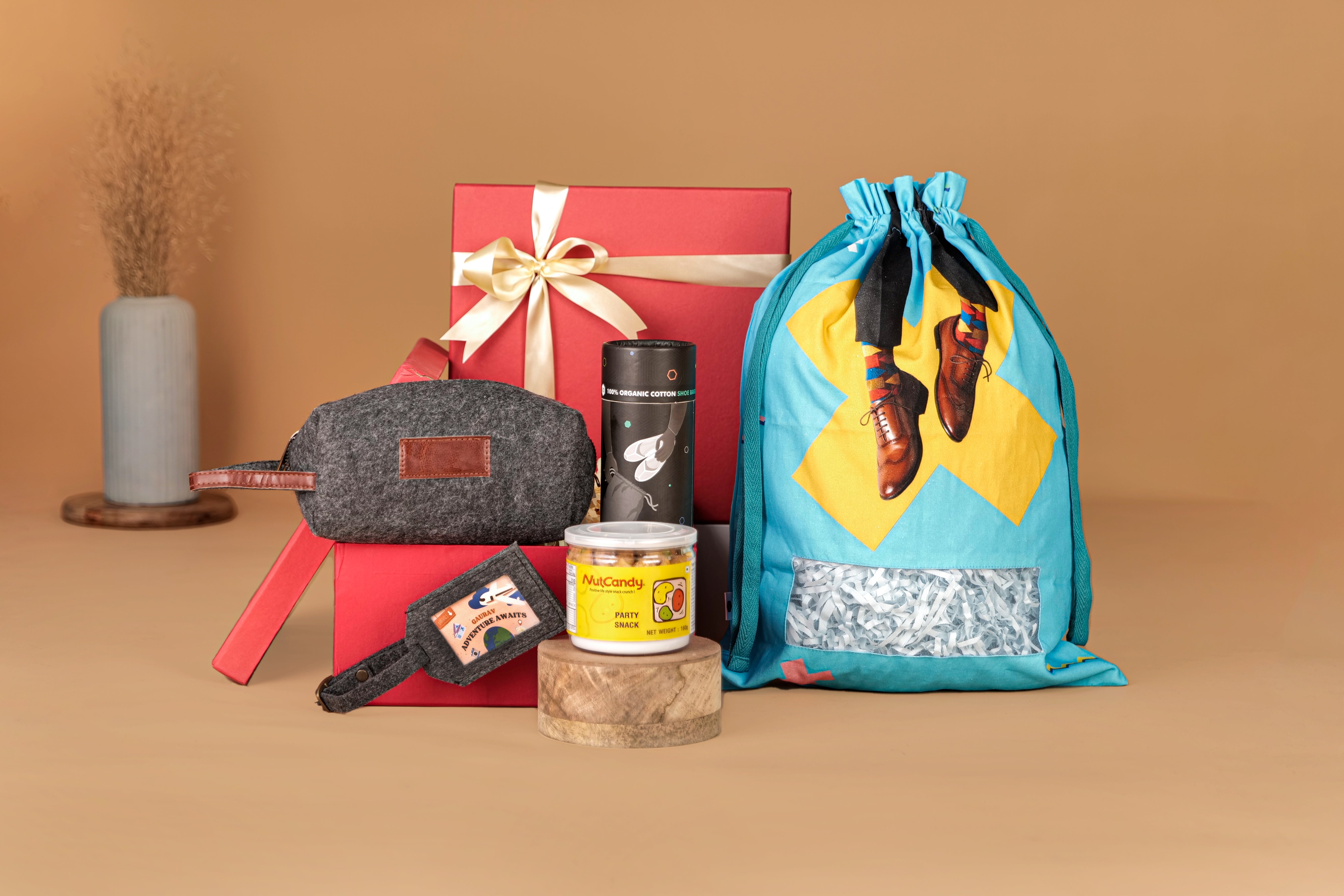 For the man who seeks both adventure and refinement, this curated "Weekend Getaway" gift box is a perfect companion for the modern man's escape. Delight him with a quirky shoe bag, adding a dash of personality to his travel essentials. Our sleek felt travel pouch and luggage tag ensure he journeys in both comfort and style. We had also added some muchies to keep him fueled. Whether it's a spontaneous road trip or a planned weekend bachelor party , let his weekend be extraordinary.