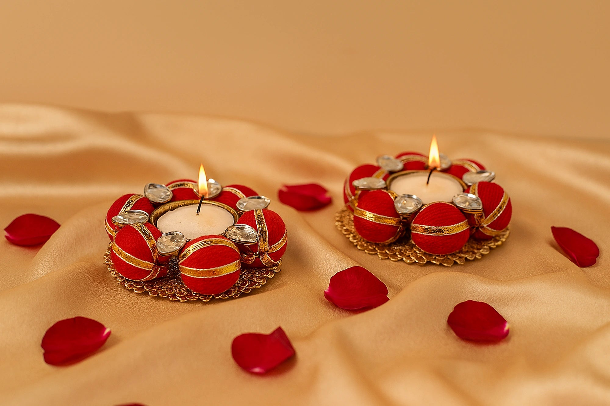 Drenched in festive hues and adorned with shimmer, our Taara is a radiant set of two handcrafted tea light holders. Featuring bold red fabric spheres detailed with gold zari and accented with crystal embellishments, this duo is a celebration essential. Mounted on an intricately designed golden base, they bring the perfect balance of tradition and elegance.