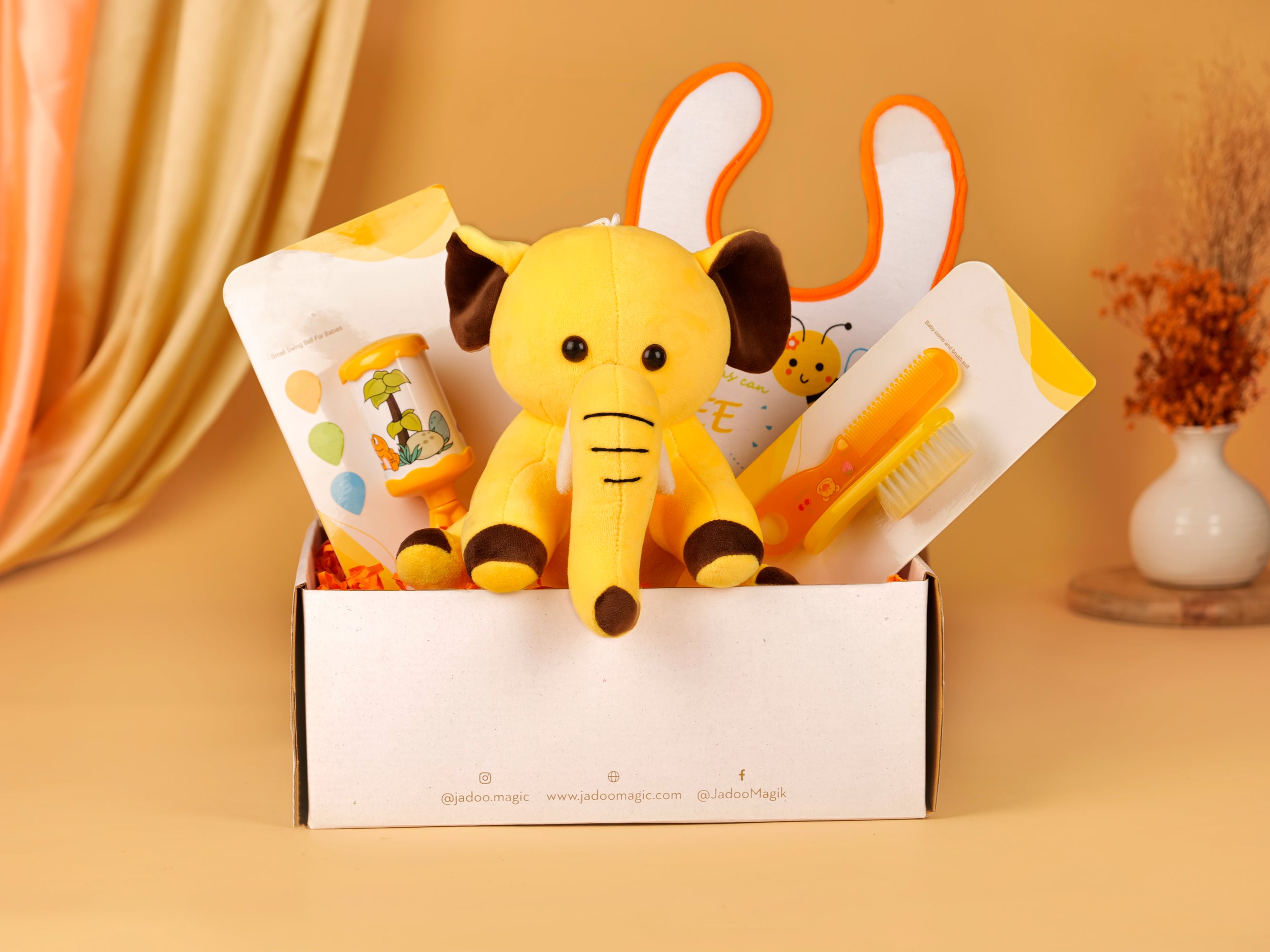 Welcome to Jadoo Magic, where we create enchanting moments with every gift. Our exclusive Gift Box comprises a charming Soft Toy Elephant Jumbo, a stimulating Toy Rattle suitable for 3M+, a Baby Comb and Brush Set for gentle grooming, and a delightful Baby Bib. Thoughtfully curated, this set embodies our dedication to quality and care, making it a perfect present for your little one or to celebrate a newborn?s arrival. Choose Jadoo Magic, where every gift is sprinkled with a touch of magic and love.