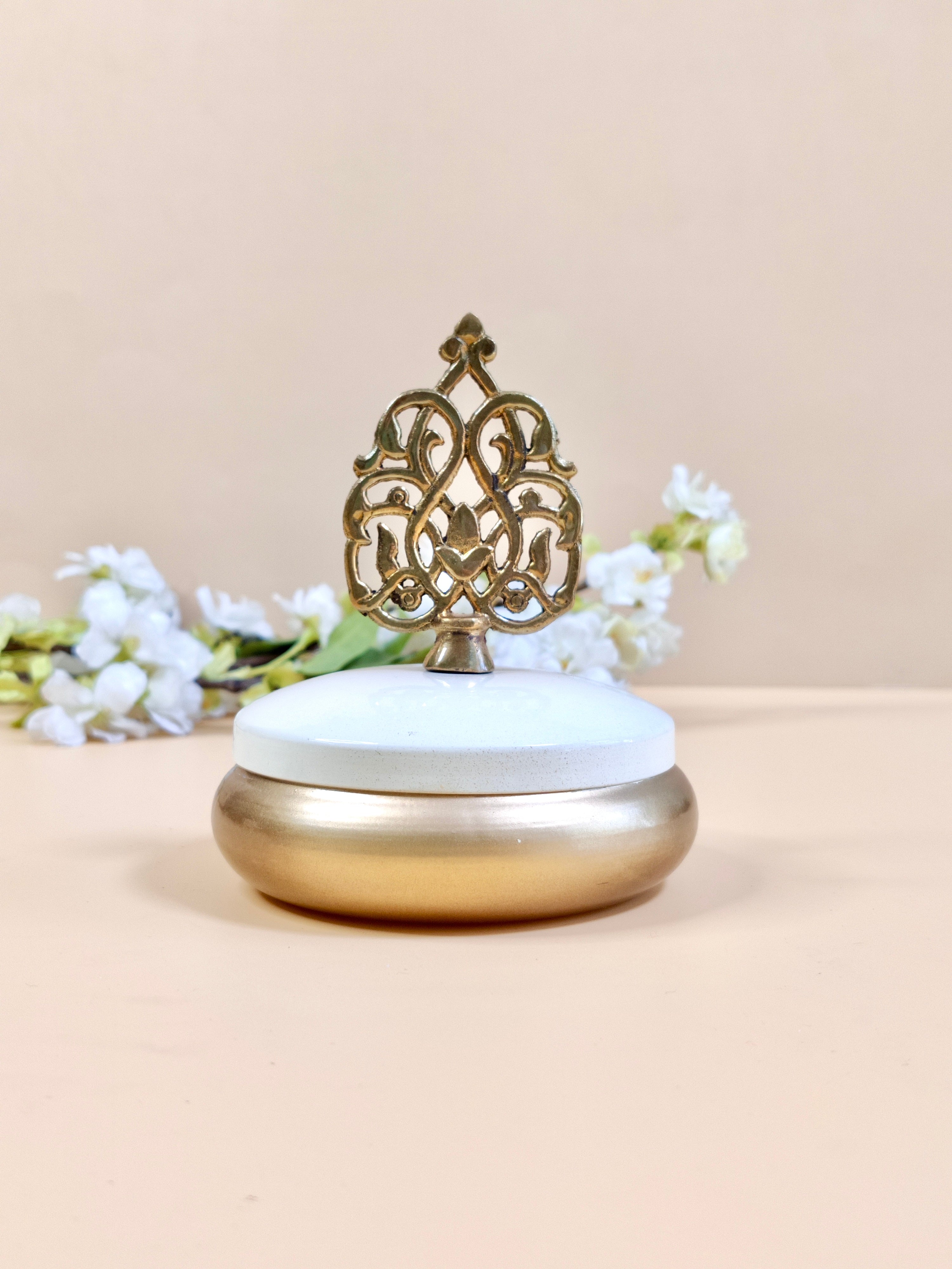 Add a touch of regal charm to your festive gifting with the Royal Lotus Jar – an elegant decorative jar featuring a beautifully intricate metallic lotus motif. The white and gold finish exudes luxury, making it a perfect centerpiece or gift box for dry fruits, sweets, or festive treats.