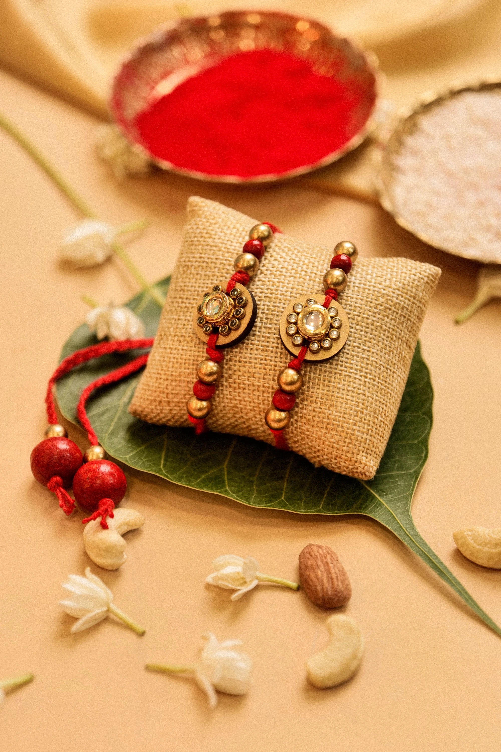 Celebrate the beautiful bond of love and respect with this exquisite Designer Kundan Rakhi and Lumba Set for Bhaiya and Bhabhi. Adorned with shimmering kundan stones, traditional beads, and rich red threads, this rakhi set brings together elegance, blessings, and festive sparkle. Perfectly handcrafted to reflect royalty and warmth, it’s a stylish way to express your affection this Raksha Bandhan.
