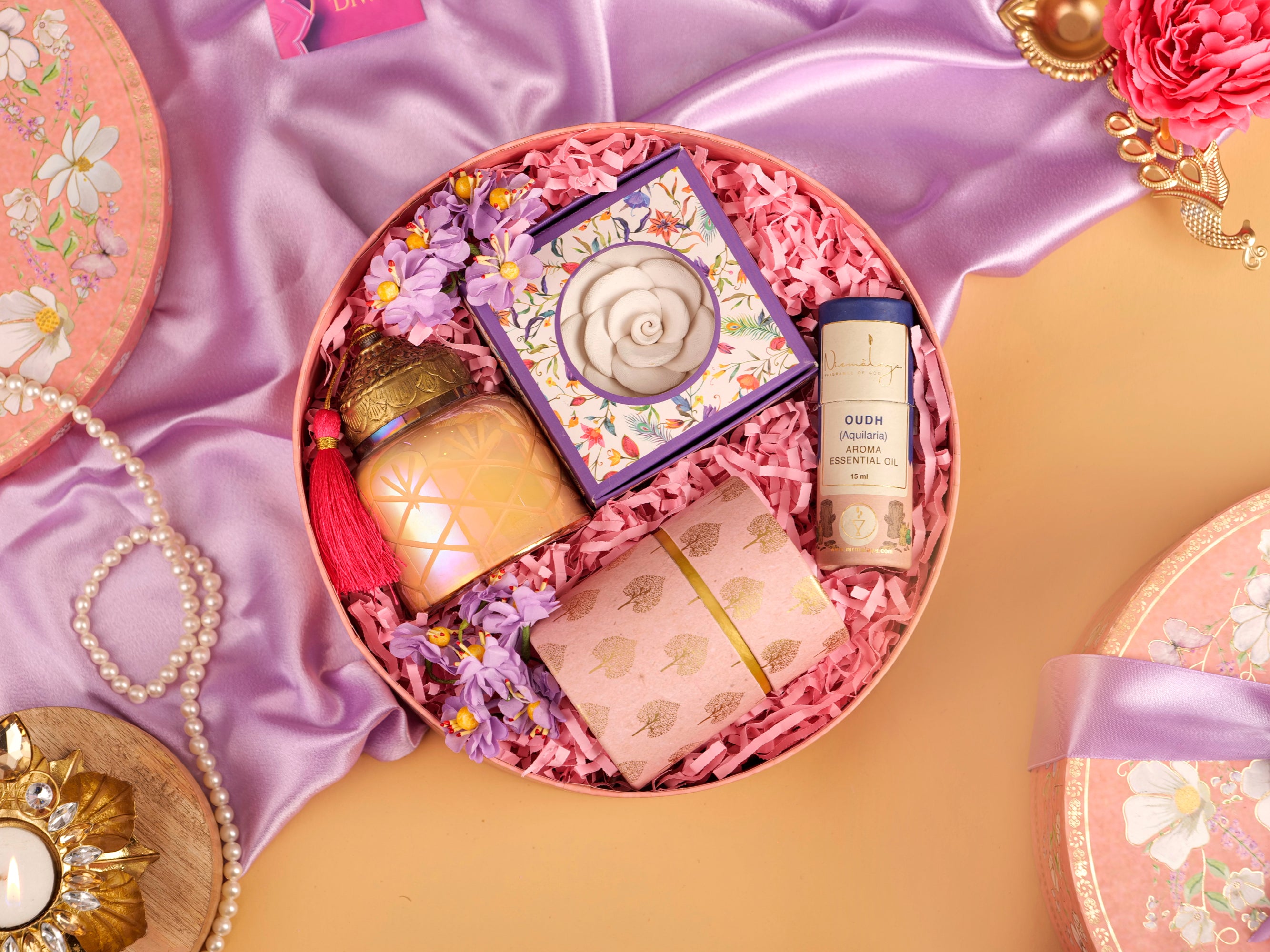 Indulge in the enchantment of Jadoo Magic with Sugandh, a bespoke premium gift box that elevates your senses. Featuring a Royal Candle with Fragrance Soy Wax and Brass Lid, each element is crafted to enhance any ambiance. The Designer Box contains 100 gm of Mixed Roasted Dry Fruits, perfect for a gourmet touch. Complementing this luxurious set is a Ceramic Flower Diffuser and a 15ml bottle of Lavender Aroma Essential Oil, promising an unparalleled aromatic experience. Experience the magic of refined gifting with Jadoo Magic's Sugandh.