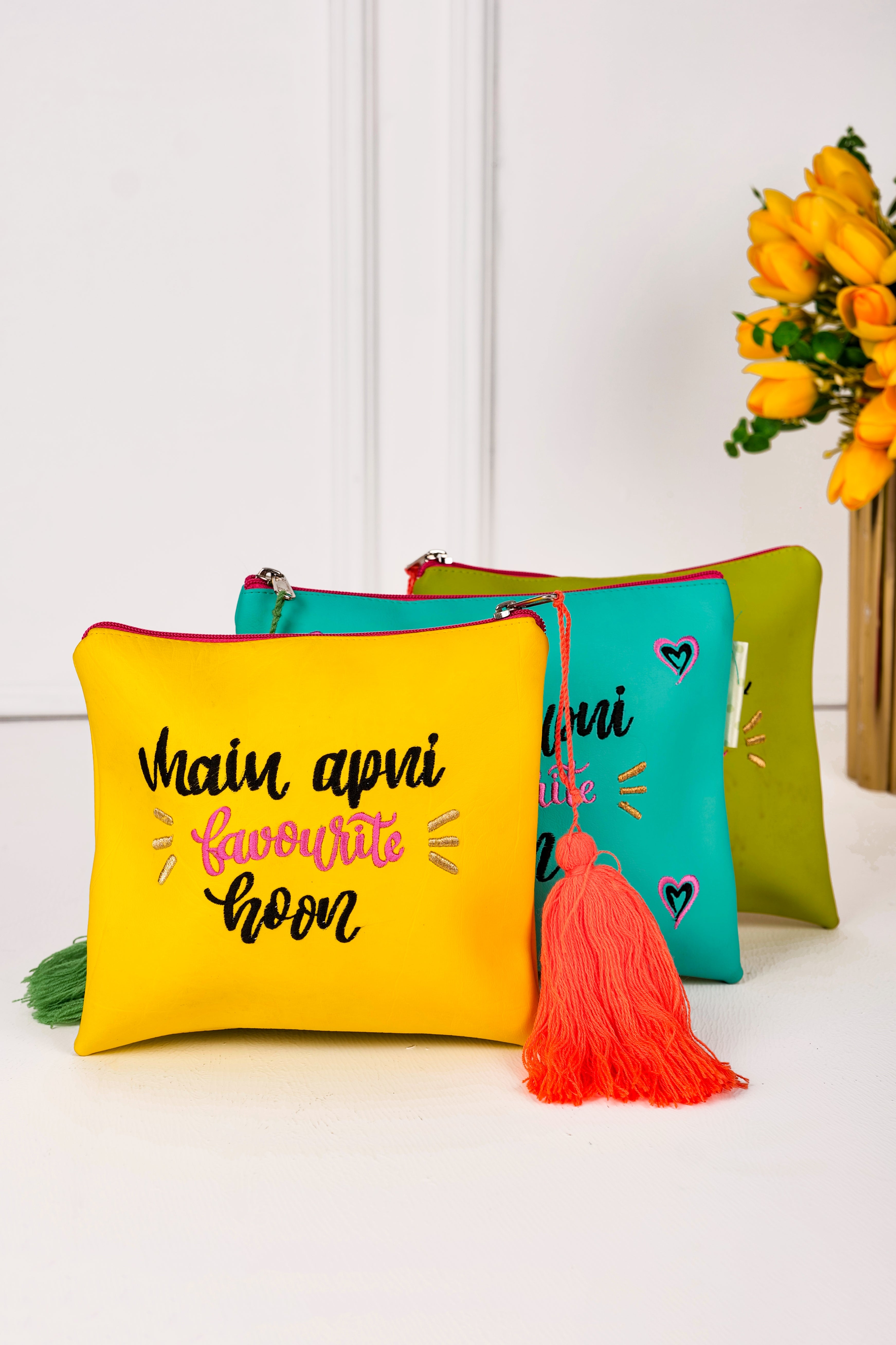 Discover the perfect blend of style and functionality with our Designer Leatherite Pouch from Jadoo Magic. Featuring the vibrant quote "Main Apni Fav Hoon", this pouch is adorned with exquisite embroidery & tassel details. Its quirky and colorful design ensures it's not just fun but also incredibly useful for storing makeup, stationary, and other essentials. A must-have for her, it effortlessly combines everyday utility with a touch of playful elegance. Make a statement and express your unique personality with this delightful piece!