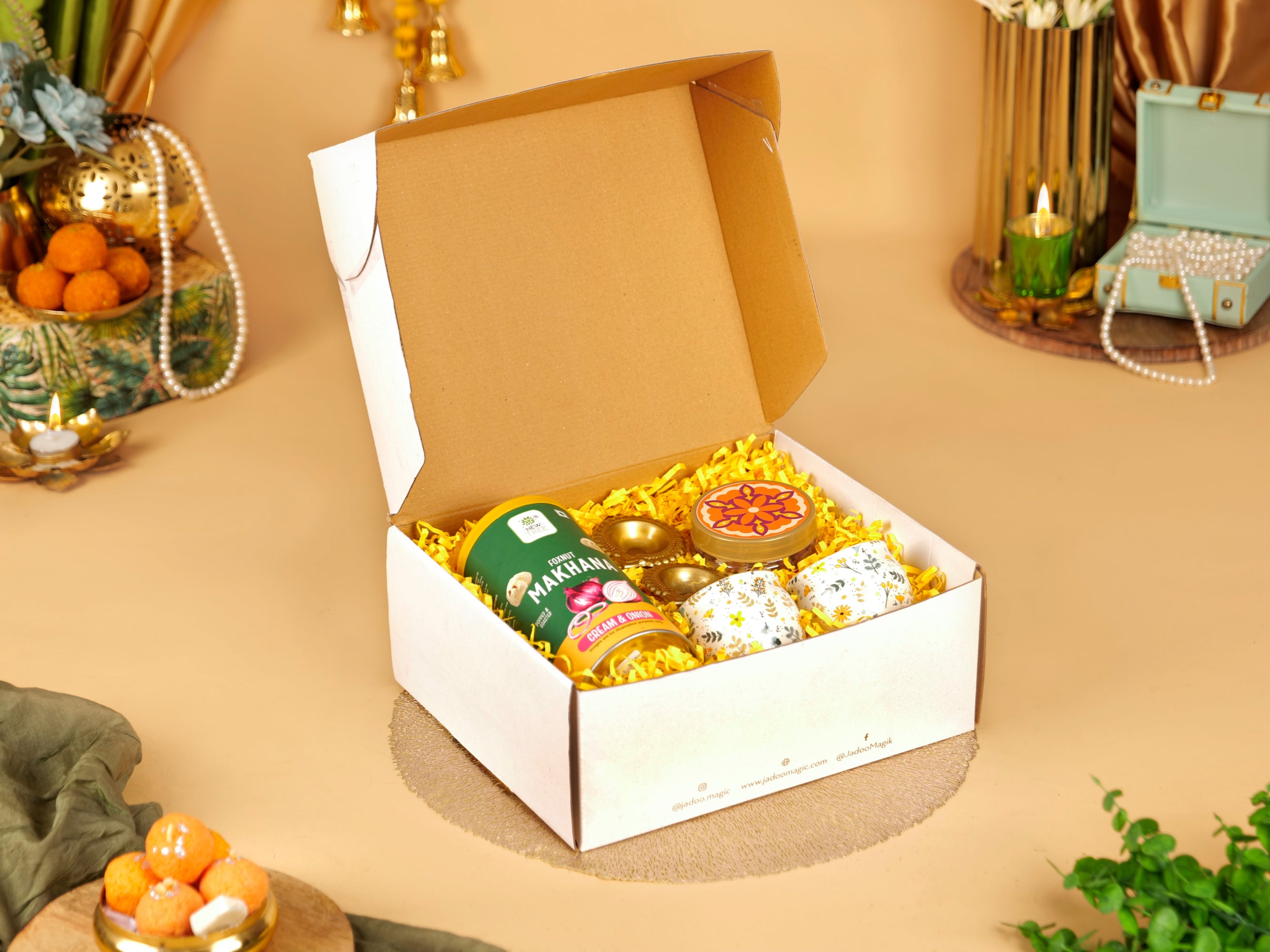 At Jadoo Magic, we present "Delightful," a beautifully crafted, budget-friendly gift box ideal for both personal and corporate gifting. The set includes two traditional Kullad cups, two elegant golden metal diyas, a jar of 100g mixed roasted dry fruits, and a pack of delicious Jumbo Makhana Cream & Onion. Perfect for the festive season, this thoughtful gift box embodies the essence of tradition and celebration. Whether you're looking for a unique housewarming gift or a festive present, Delightful offers a touch of elegance and warmth.