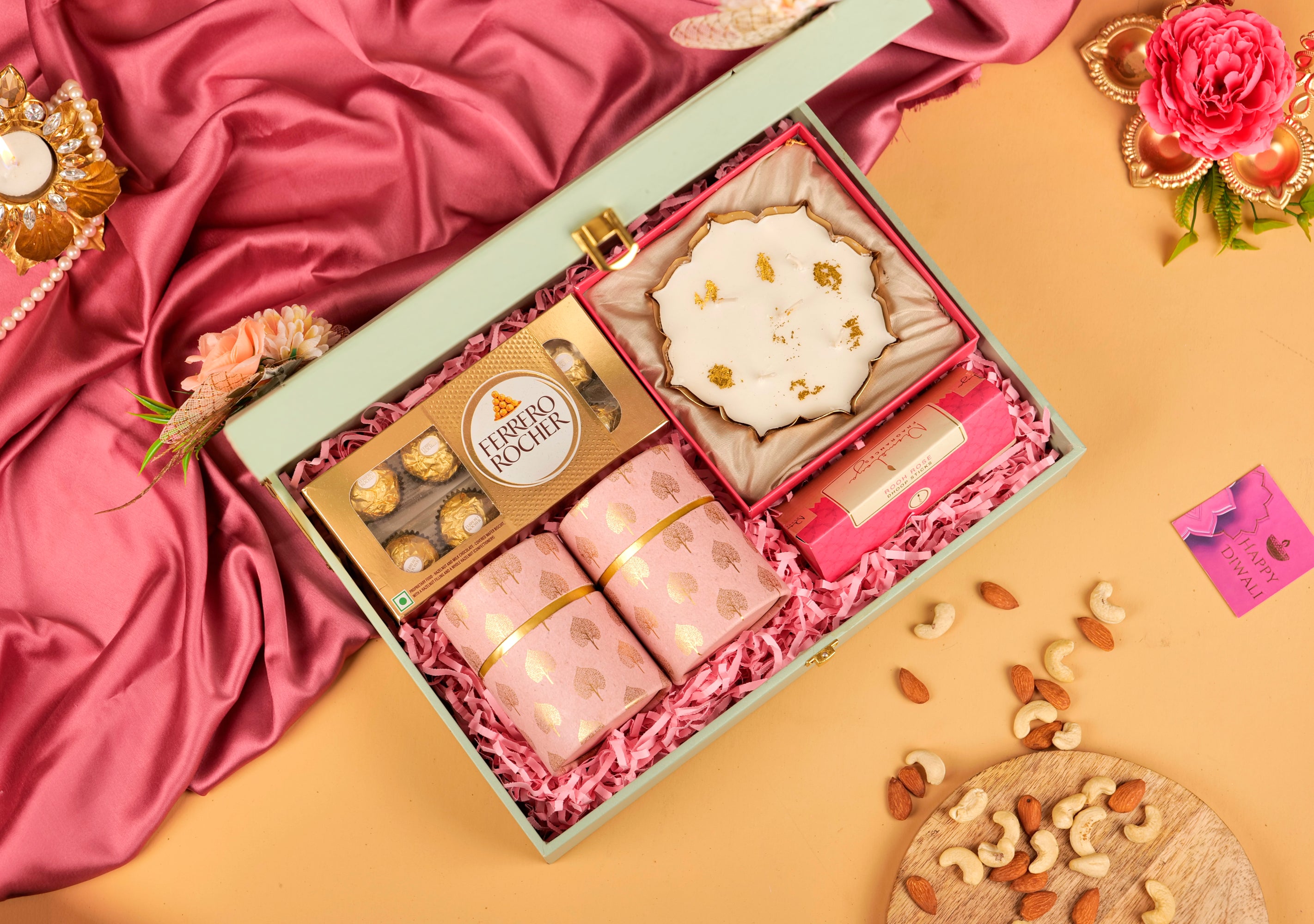 Welcome to Jadoo Magic, where extraordinary gifting meets sophistication with our Saubhagya set. This luxurious collection features an Elegant Truck Box containing a Lotus Urli Fragrance Candle Gift Set in Oudh, a Designer Box with 100 gm of Roasted Cashews, another with 100 gm of Roasted Almonds, a Ferrero Rocher Chocolate Box, and Dhoop Sticks-Rooh Rose. Each item is handpicked to offer a delightful sensory experience, perfect for special occasions or treating yourself. Discover the magic of Saubhagya today with Jadoo Magic!