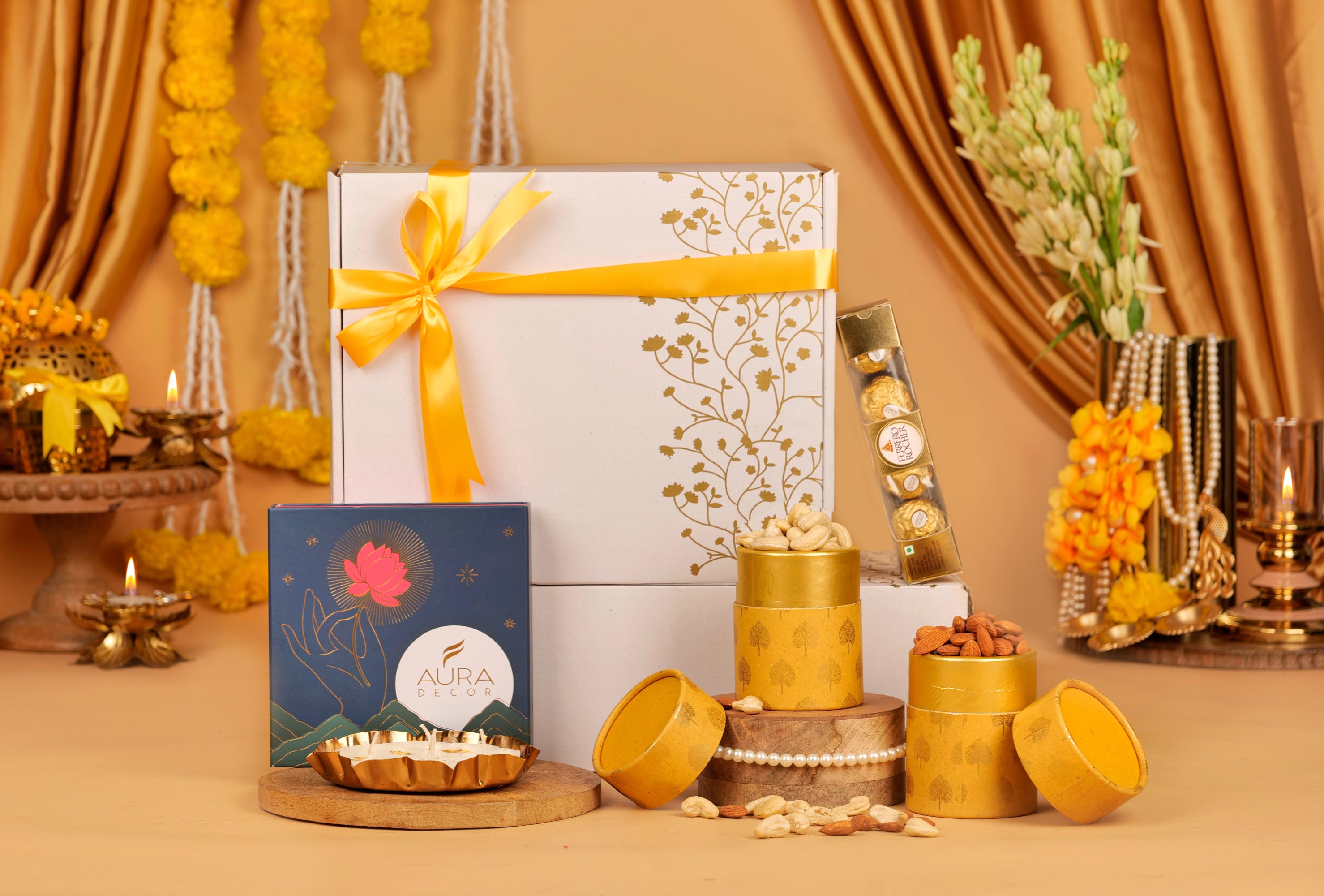 Experience the ultimate gift of elegance with Shagun, exclusively from Jadoo Magic. This exquisite gift box includes a Lotus Urli Fragrance Candle Gift Set, adding a touch of serenity to any space. Complemented by a designer box containing 100 gm of roasted cashews and another with 100 gm of roasted almonds, it brings both taste and style. To top it off, indulge in the decadence of a Ferrero Rocher Chocolate Box. Perfect for Diwali or any occasion, Shagun embodies the quality and sophistication you've come to expect from Jadoo Magic.